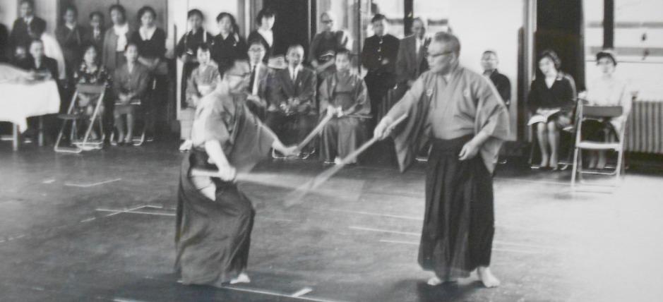 五方ノ形は、日本刀ではなく細身で軽い木刀を使用し、右手に大刀、左手に小刀を手にしますが、他の流派にあるような木刀同士で早く激しく打ち合う動作はありません。強く大きな気位で、ゆっくりと流れるように相手を追い詰めていく動作の形です。打太刀が、無声による静・動・寂を繰り返す中で、仕太刀は、「ズウー」という発声とともに強い気位で攻め、「タン(断)」という発声とともに二刀の刃筋を立てて相手を斬り、「ヘッタイ(絶対)」という発声とともに相手の動きを封じます。このように、二天一流の五方の形は、まるで「能」の世界のような幽玄さに特徴があります。